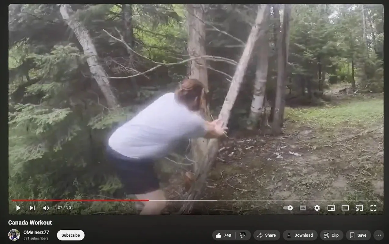 At his uncle’s cabin in the remote wilderness of Canada, Quinn chopped wood, flipped tires, and power-cleaned 100-pound propane tanks. Here’s the full video.