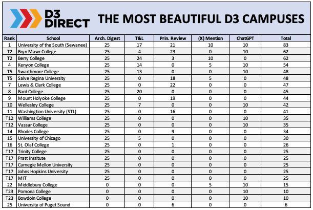 To ensure we’d scraped everything the web had to offer, we also asked ChatGPT to weigh in on the debate. If a campus was mentioned in ChatGPT’s output when asked about the most beautiful D3 colleges in America, we assigned 10 points.